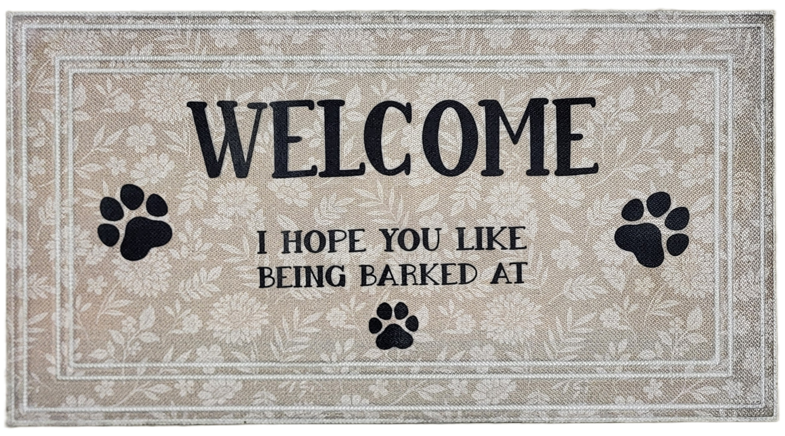 Durable weather-resistant door mat with ivory floral print polyester fabric on top of rubber non-slip backing. Perfect for indoor or outdoor.